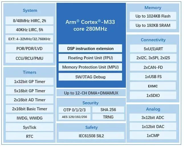 该系列基于Arm®v8-M架构,主频高达280MHz,具备灵活的存储配置、高集成度、内置多种安全功能,为高性能计算提供坚实基础,可广泛应用