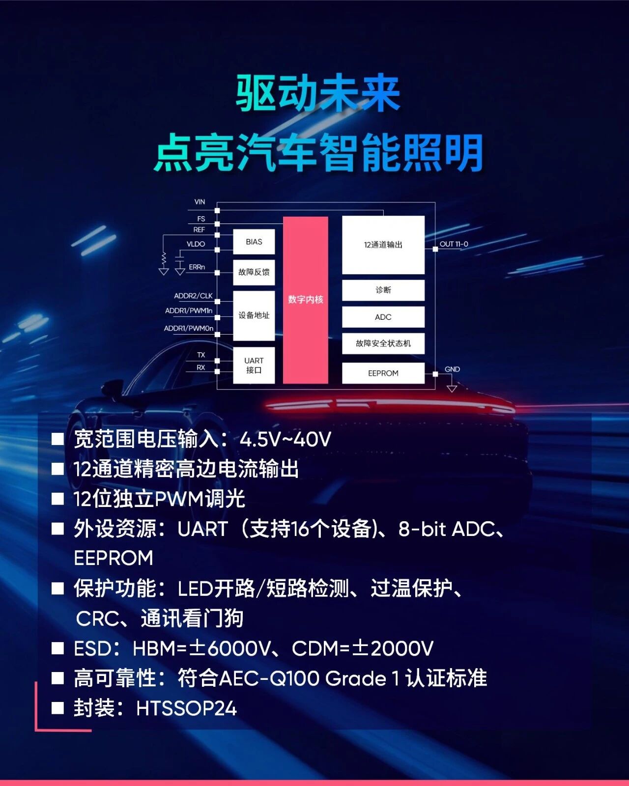 售服务和技术支持。另可提供“车规级MCU+LED Driver”全栈式车灯解决方案,可适用于汽车贯穿式/图形化尾灯、前照灯、动态流水灯、