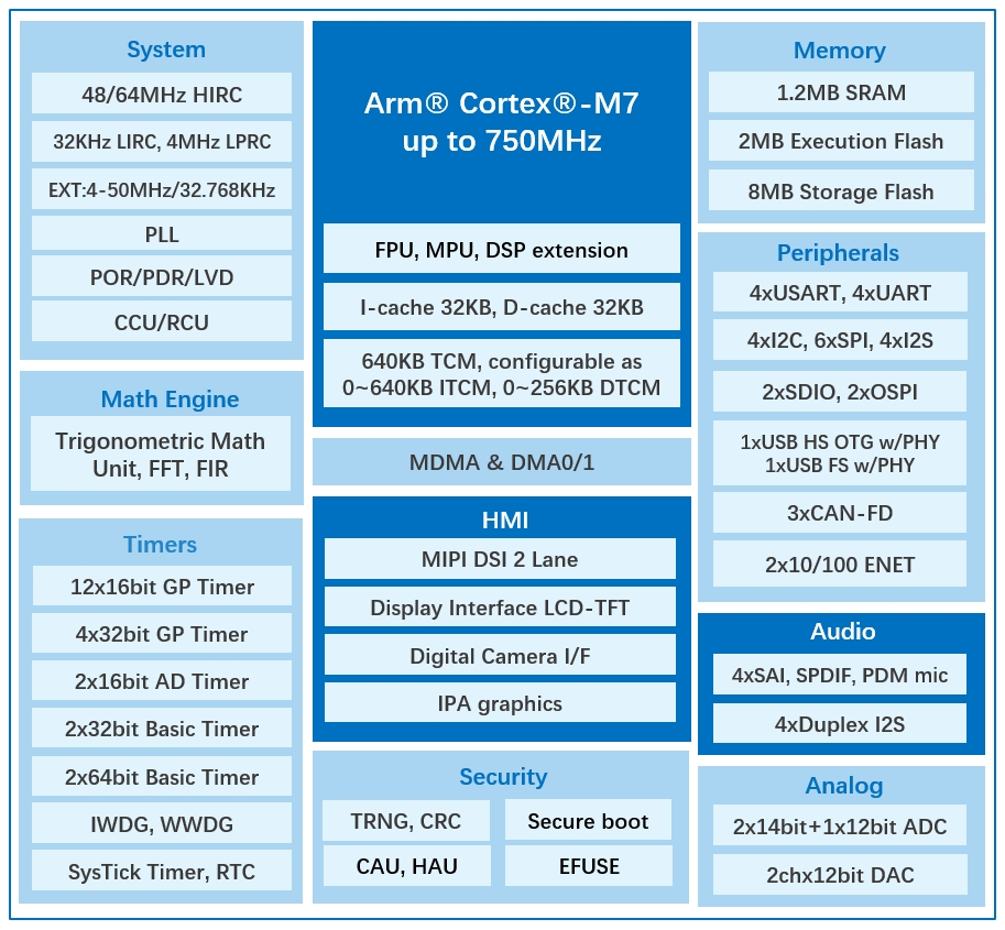 主频高达750MHz,配备高速大容量内存架构及640KB可与CPU同频运行紧耦合内存(TCM),搭载专用数学加速引擎及丰富的外