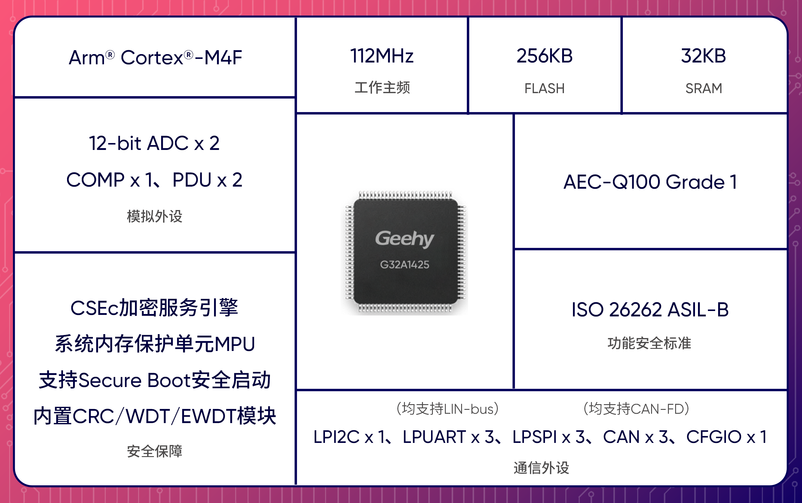 G32A1425系列保留关键配置,搭载Arm®Cortex®-M4F内核,内建FPU浮点运算单元,最高工作主频112MHz,严格遵循车规级设计理念,