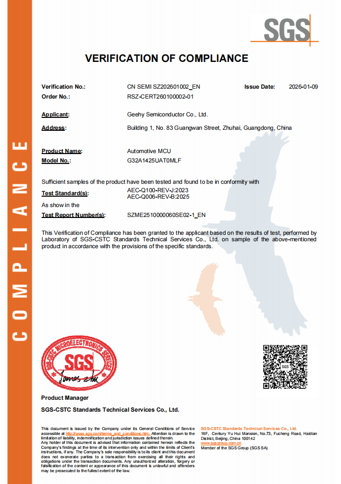 G32A1425系列汽车通用MCU,支持LQFP48/64/100三种封装,已通过AEC-Q100 Grade 1车规认证,目前已量产供货。